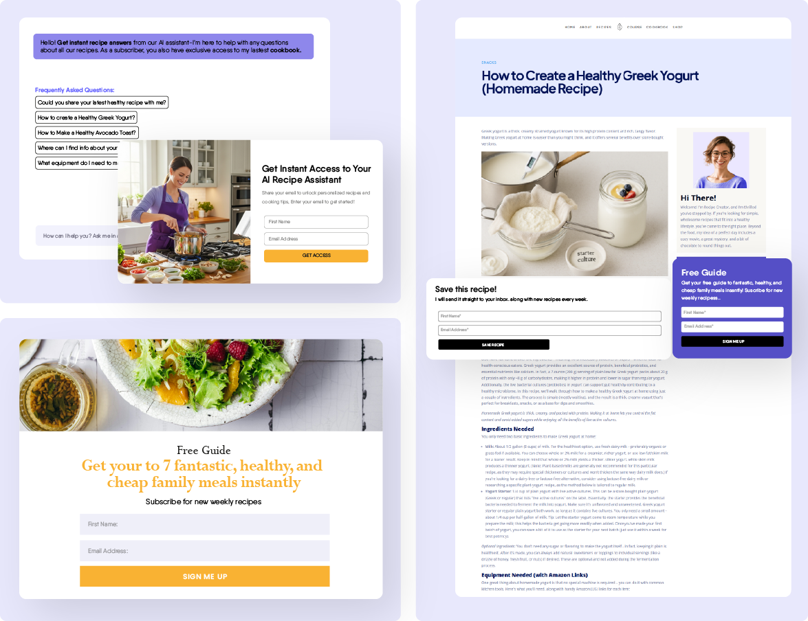 Add the on-page AI Recipe Helper—answer questions, trade the next answer for an email address, and store the context in each subscriber profile for follow-ups.