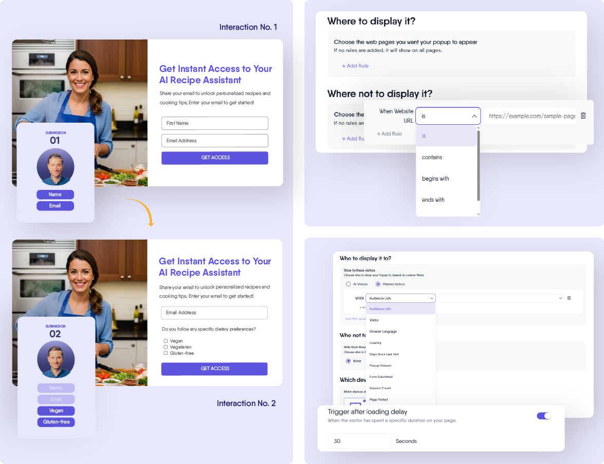 Segment your audience by diet, cuisine, skill level, or any other attribute. Build rich Subscriber Profiles and use these details to target popups and emails with precise display rules and audience filters.