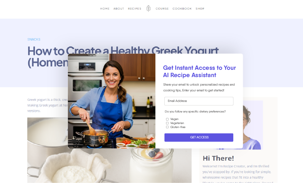 Turn on-page recipe help and clean popups into subscribers, value first, email second.