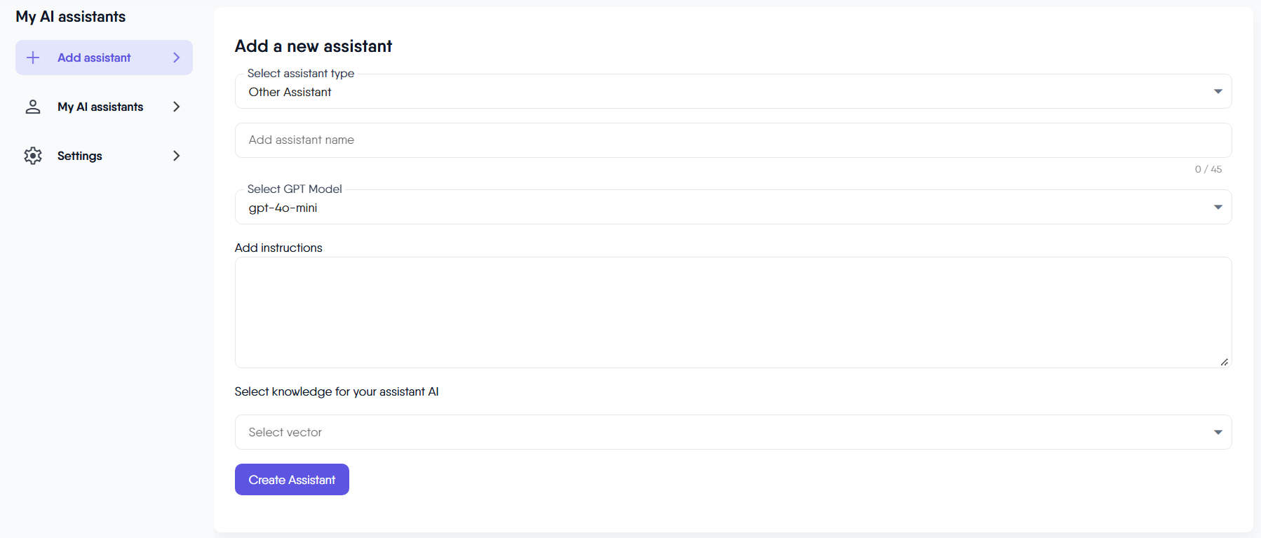 - After filling in all required fields, click on the “Create Assistant” button. This will finalize the creation of your new Assistant.