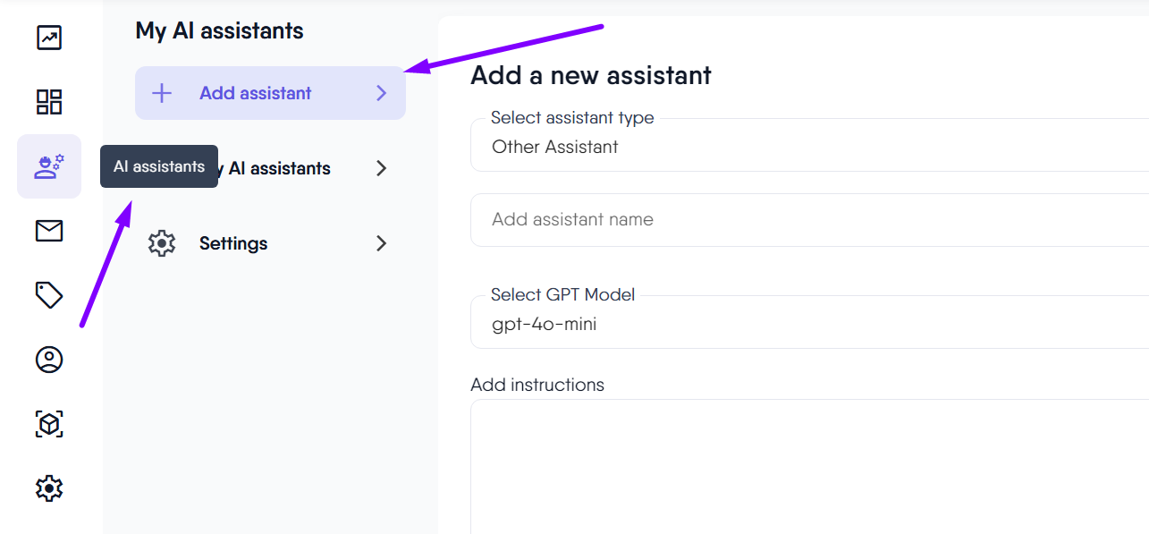 In the Add Instructions text box, provide clear and concise directives to guide how the assistant should behave and interact with users. For example, you can specify the type of responses it should provide or indicate a particular tone of voice to adopt.