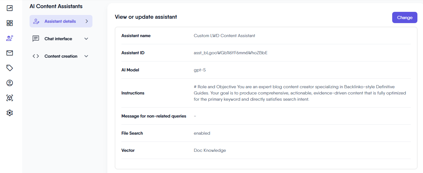 On the Assistant Details Page, you will find the following settings: