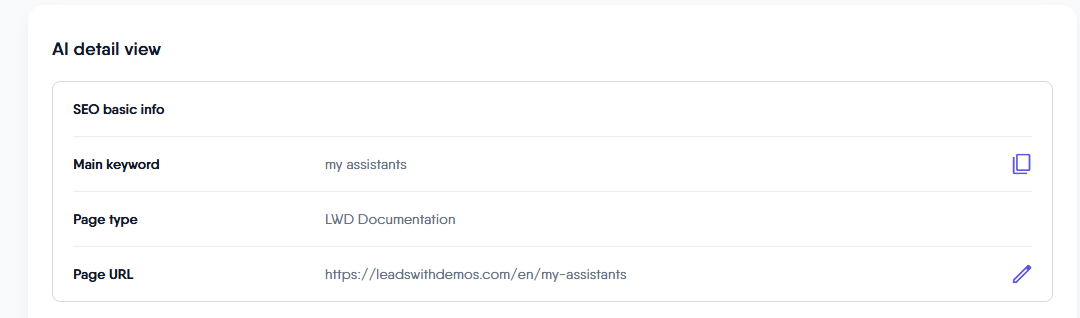 The AI Content Detail View page shows all the essential elements needed to optimize your on-page SEO, based on the main keyword you’ve selected. Each blog article or page is linked to a main keyword. If the page URL already exists, you can also scrape its HTML content for further use, such as creating custom knowledge for your AI Assistant in your LeadsWithDemos site. Here’s what you can expect to find: