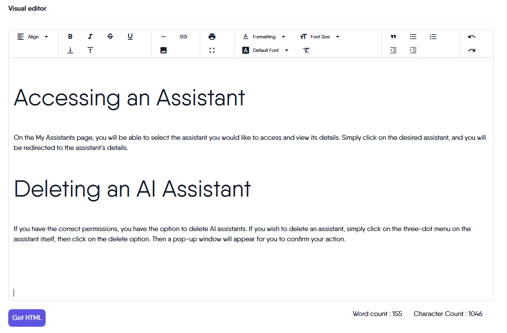 If you make any changes in the Visual Editor, it’s important to click the “Get HTML” button. This ensures that your latest modifications are accurately converted into HTML before you copy, export, or save the content for future use. Always use “Get HTML” after editing to keep your HTML output up to date for seamless integration with other features. Once you have the updated HTML, click the “Save HTML Content” button under the HTML viewer section to ensure your changes are saved in the database.