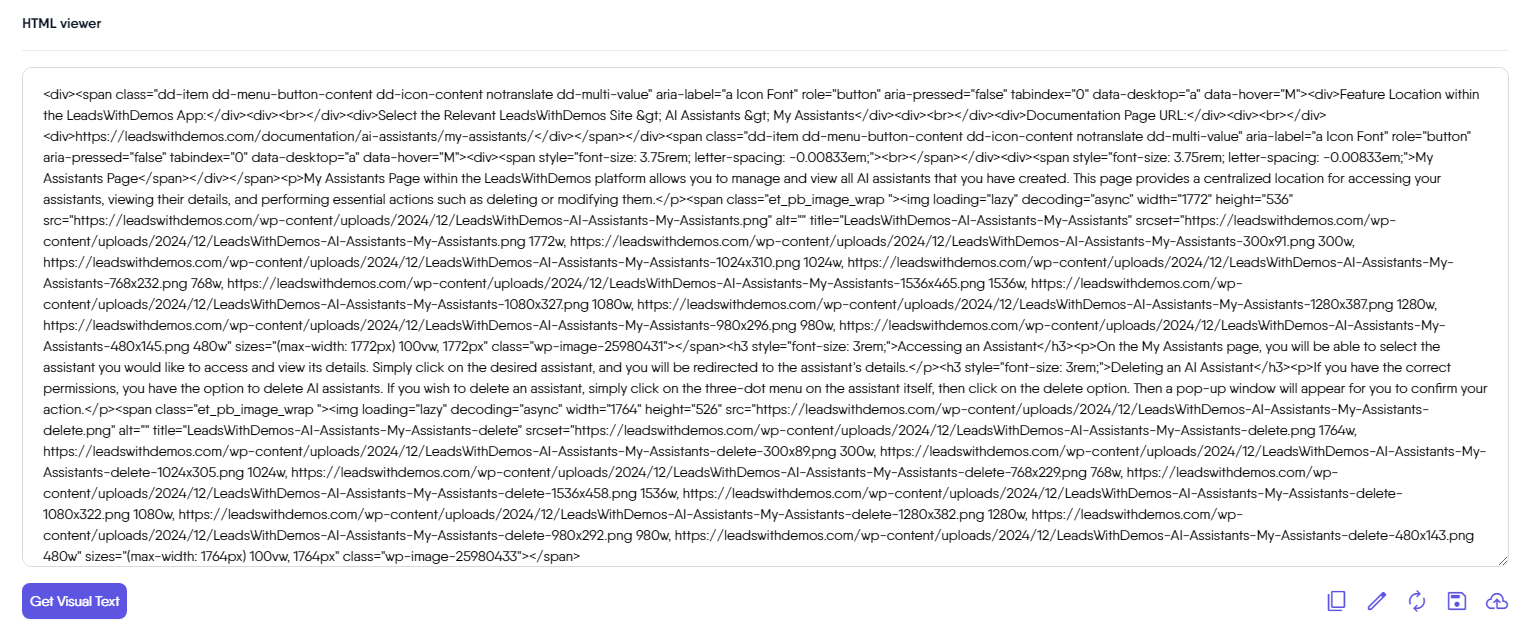 If you plan to use your website or blog content as knowledge source for your custom AI Assistant, LeadsWithDemos relies on the saved HTML content. This allows the custom-trained AI Assistant to navigate and utilize links and URLs within your content. Therefore, it is crucial to always save your changes whenever you modify the HTML content.