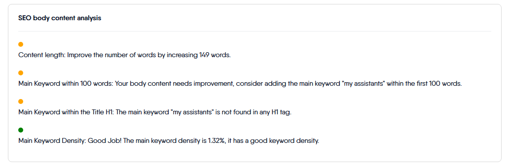 - Orange: Suggests that the content length needs to be increased. Specific recommendations on how many additional words are required will typically be provided.