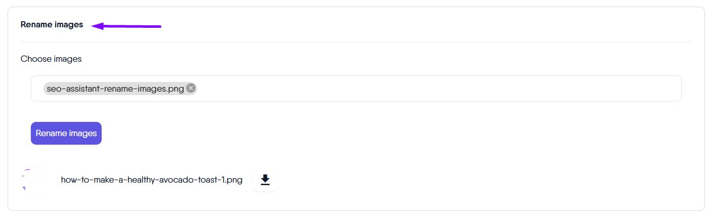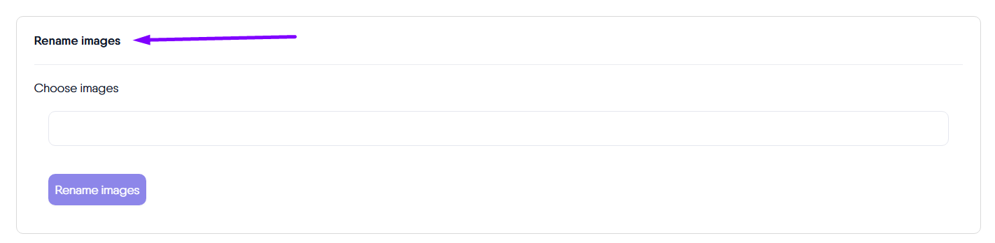 To use this functionality, simply click the field and select the images you want to update. The system will then rename each image file to include your brand name and primary keyword, ensuring consistency and increasing the relevance of your visual content.