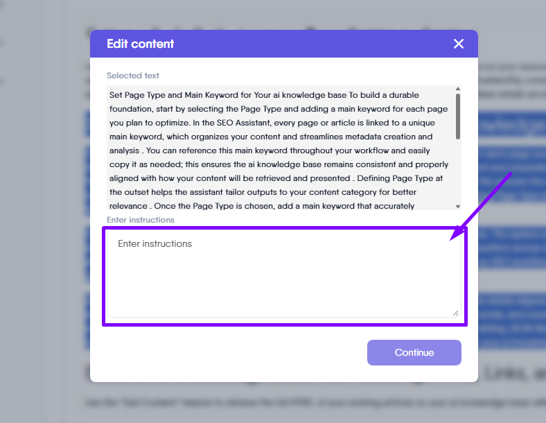 This will open a popup window displaying the selected section, where you can enter specific instructions for the AI about the changes you’d like to see. Once you’ve added your instructions, click “Continue” and the AI will update the content based on your input.