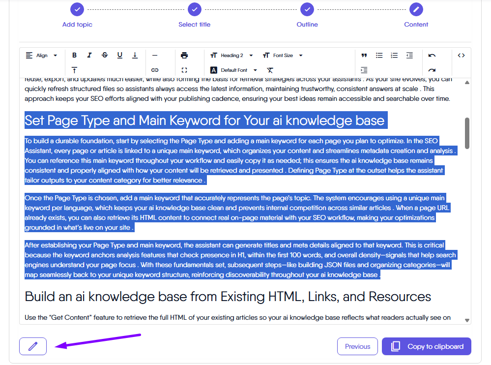 After your SEO content is generated, you can easily make changes to any part of the article. Simply select the content section you want to adjust, then click the pencil icon to edit.