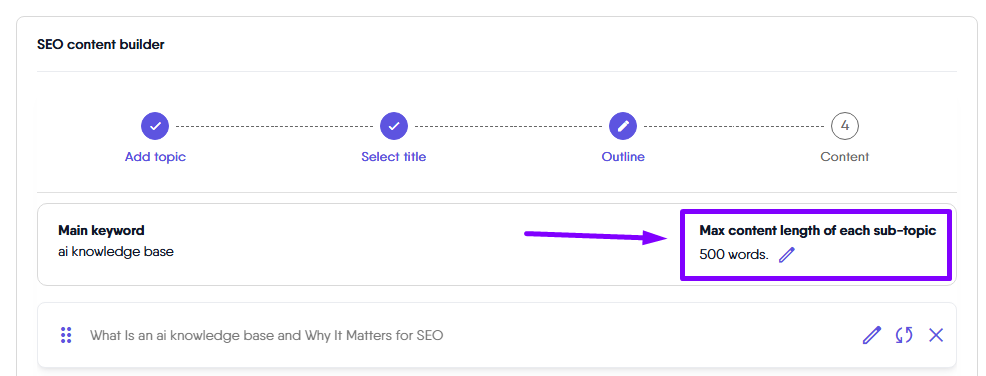 This feature allows you to set a maximum content length for each sub-topic within the SEO content builder. The word limit serves as a guideline for each sub-topic, with a maximum of 500 words. The AI uses this limit to draft concise and focused content for each section.