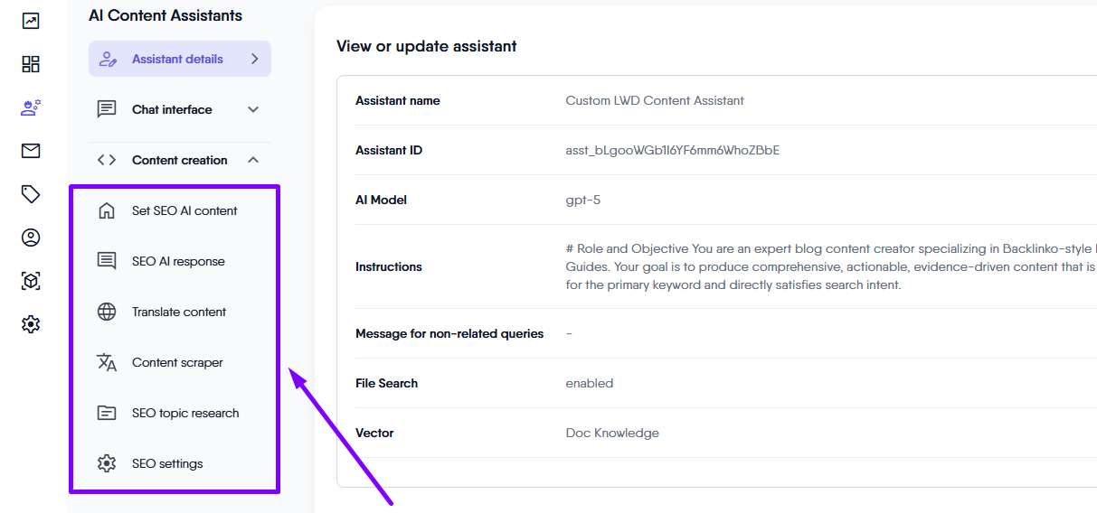 The Assistant analyzes your content for keyword placement, length, and density, and provides actionable suggestions to improve your on-page SEO. This helps ensure your content meets established SEO guidelines, making it more effective and visible to search engines.