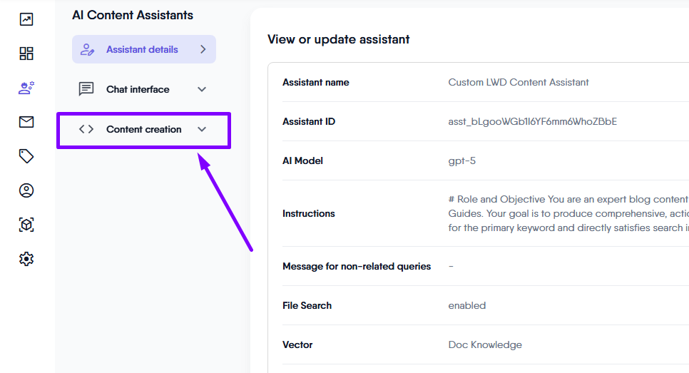 The content creation module within your AI Assistant includes the following pages: