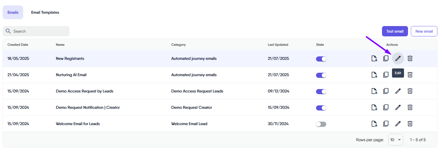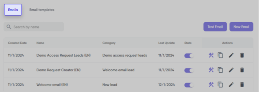 This feature displays the current state of each email, indicating whether it is toggled off (inactive) or toggled on (active). It is crucial to understand that only emails marked as ‘toggled on’ are sent by the system. Therefore, to ensure your automated emails are dispatched as intended, verify that they are set to ‘toggled on’.