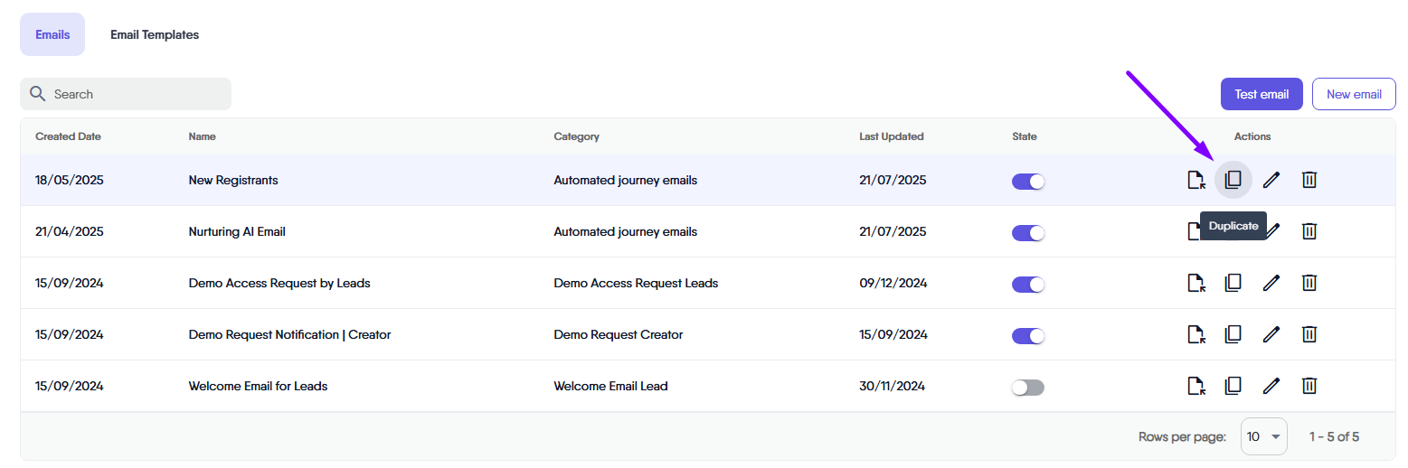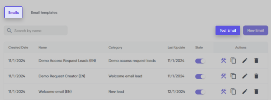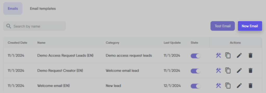The Search Bar in the Emails Tab is a convenient tool for quickly locating specific emails. It’s particularly useful when you have many emails and need to find one based on its name, category, or other attributes. Simply enter a keyword, and the search function will display relevant emails, simplifying the process of managing your automated emails.