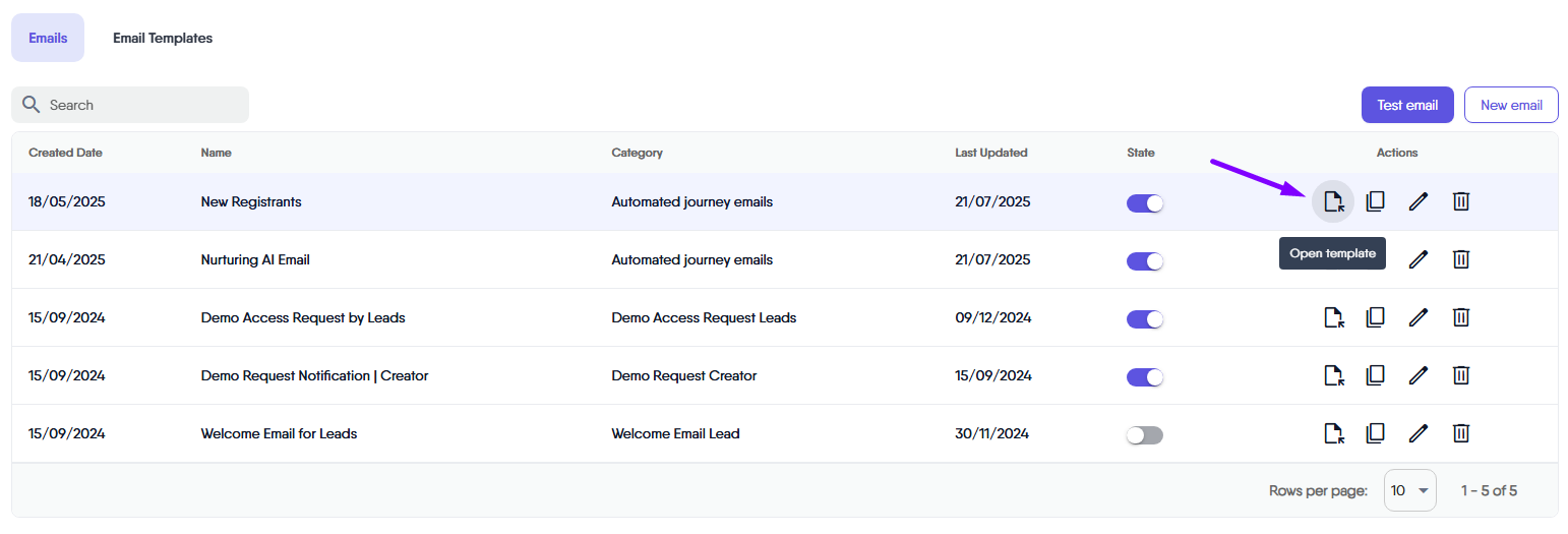 Once you have added the email details, click on the “Create Email” button located in the popup window. You will be redirected to the details table, where you will see the newly created email and be able to click on the “Open Template” icon located in the action column. Once clicked, the drag-and-drop email builder interface will open, allowing you to customize your email’s layout and content accordingly. Once the changes have been made, you can simply click on save.
