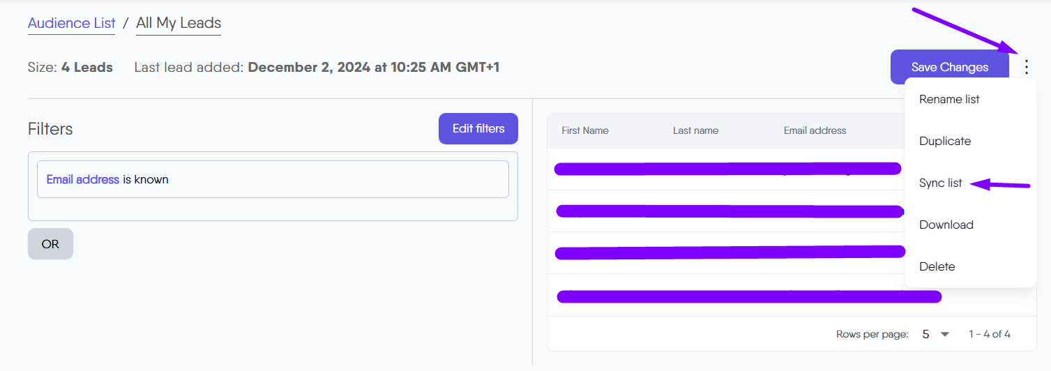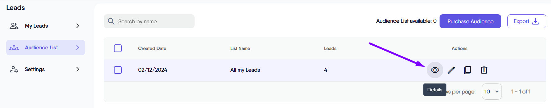 To initiate the audience list sync, first find the audience list you would like to synchronize by clicking on “Details” for that specific list.