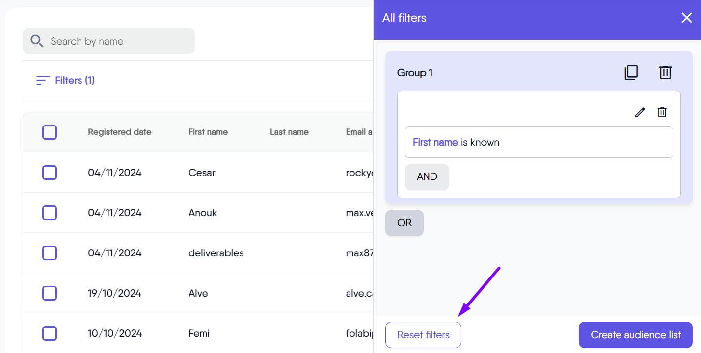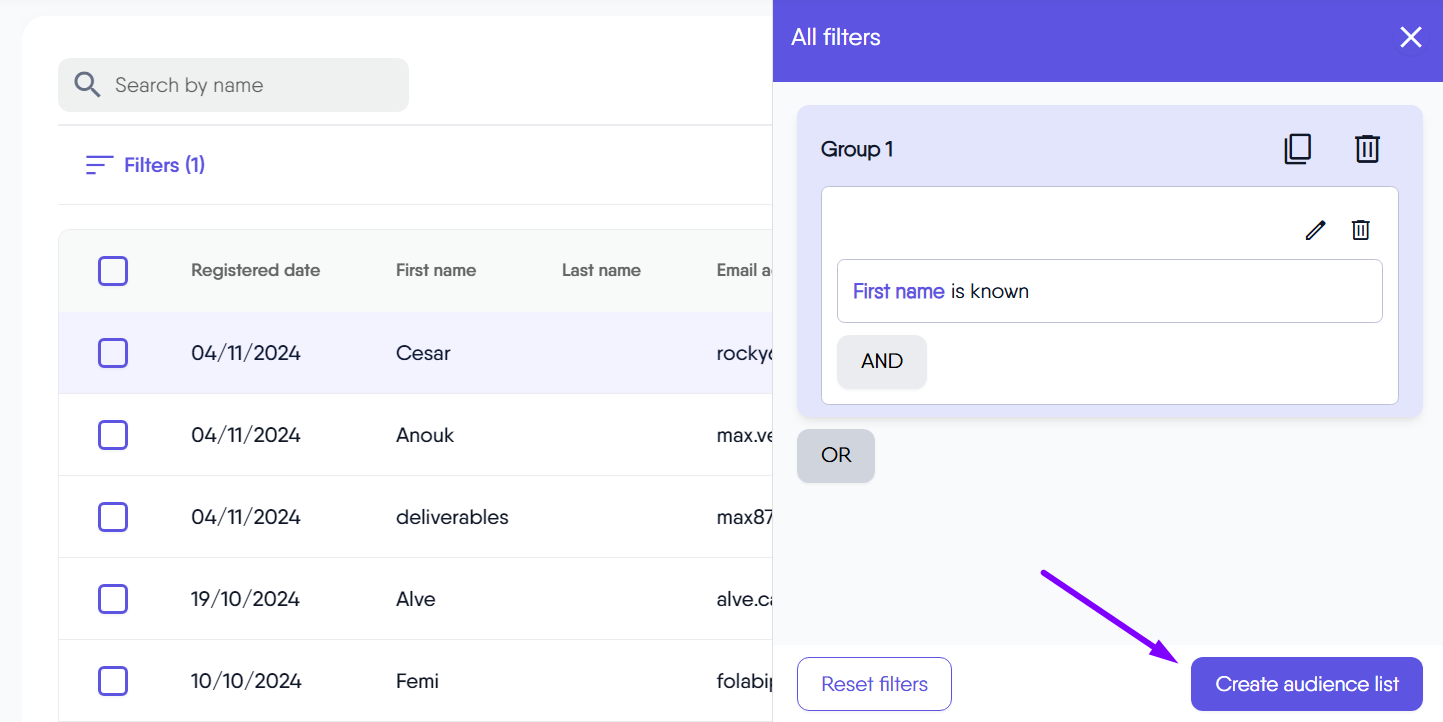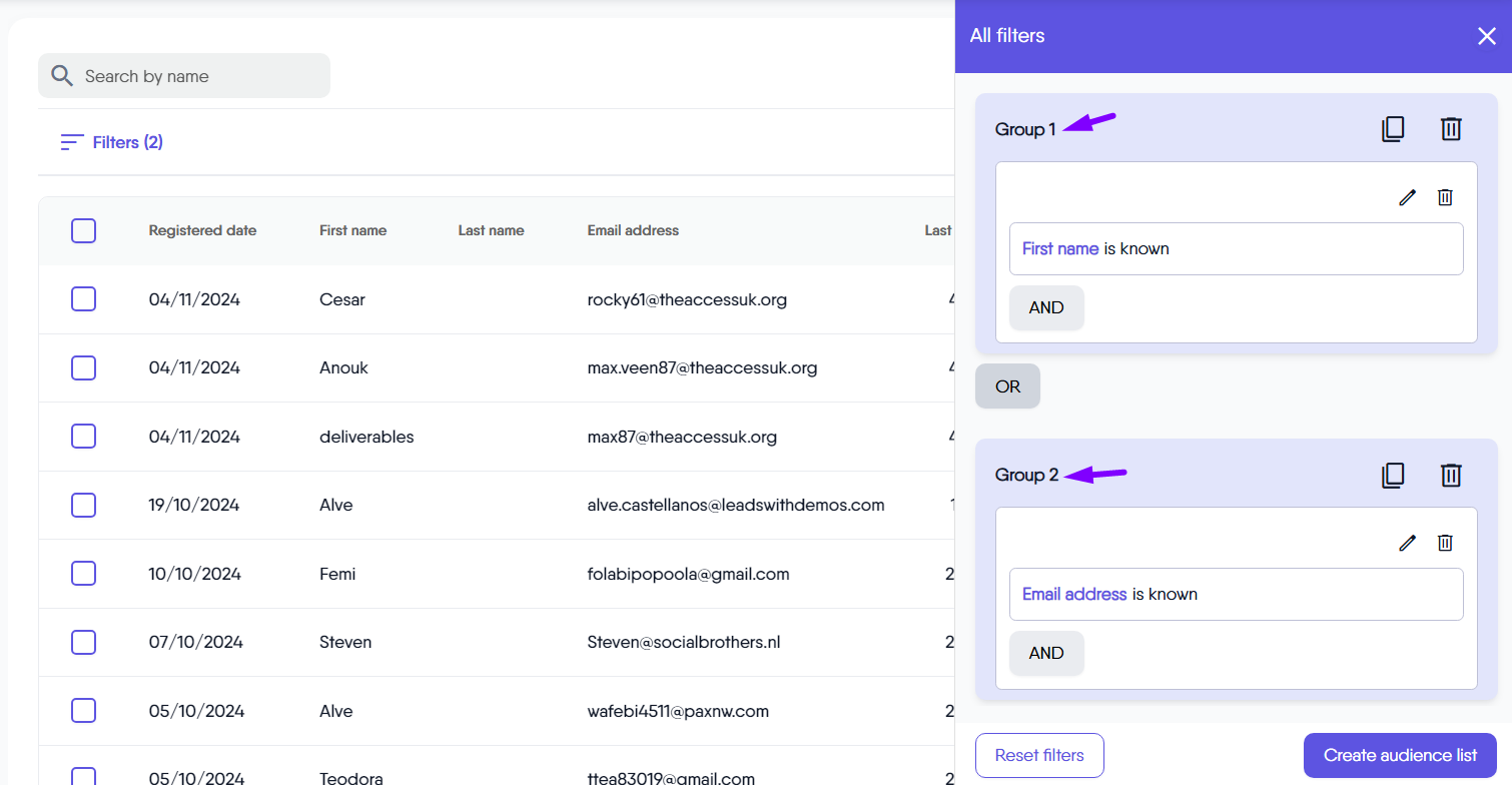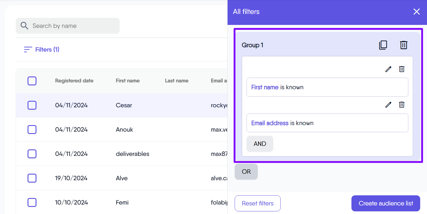 You can quickly build custom audience lists using a wide range of criteria, including contact details, demographics, interests, interactions, and behaviors. These powerful filters help you target your audience with greater precision, making your email marketing more effective and relevant to each segment.