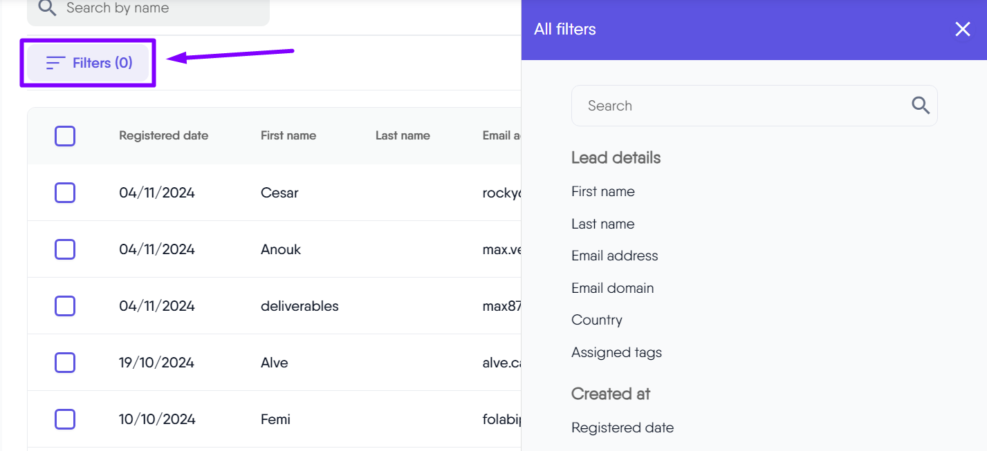 Advanced filters in LeadsWithDemos support text, date, selection, boolean, and numerical criteria. This flexibility lets you filter subscribers by attributes such as: