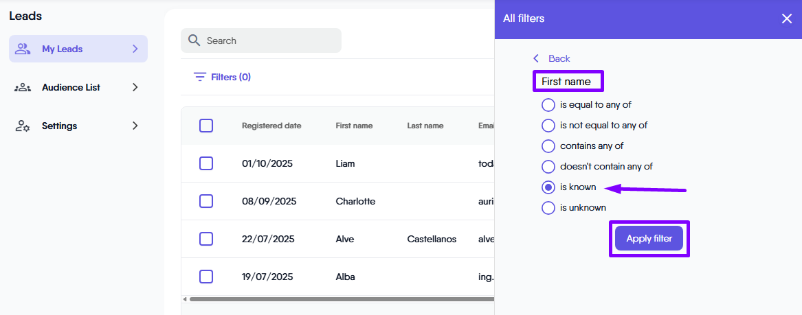 Once you click on the “First Name” filter, you can select the criteria “is Known”. Then, click the “Apply Filter” button.
