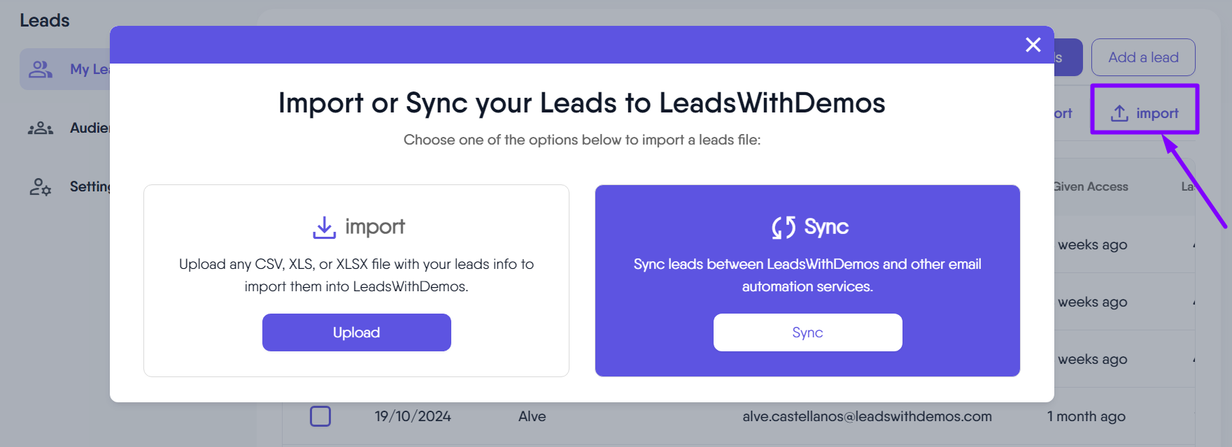 There are two primary methods for importing subscribers into your LeadsWithDemos site: File Upload and Sync. When you click on the ‘Import’ button, a popup window will appear, allowing you to decide which method to use.