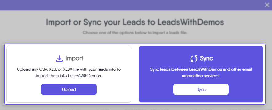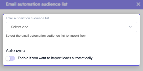 When selecting the Sync method to import your subscribers, a popup window will appear for you to select the audience list that you would like to import from your email automation service. If you do not see any email list, it means that you need to go to integrations within your LeadsWithDemos site to integrate your first email automation audience list.