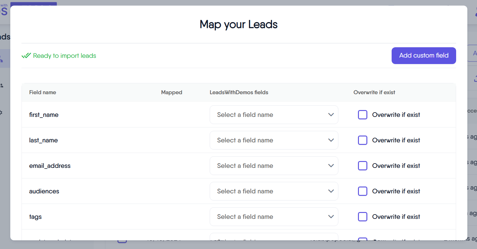 Note: If you need to create custom fields for the imported data, you can do so directly from the “Map Your Leads” window or from Leads > Settings > Custom Fields > Add Custom Fields. Once created, you can select the newly created custom fields from the dropdown list in the LeadsWithDemos Fields column during the mapping process.