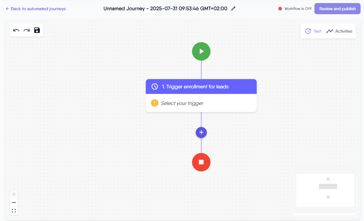 The Canvas Minimap provides a helpful overview of your entire automated journey, making it easy to navigate and manage complex workflows. This feature acts as a small map of your journey builder workspace, allowing you to see the complete structure of your workflow at a glance—even when working on large or multi-step automations.
