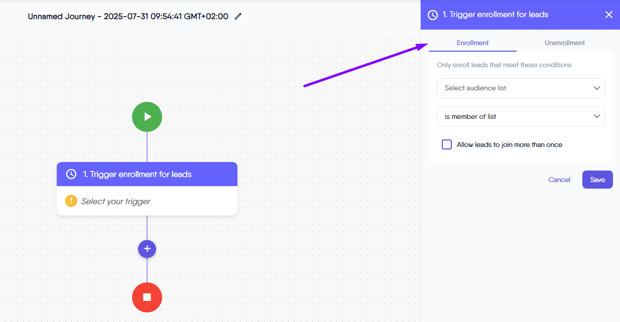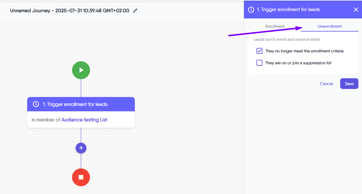 The Unenrollment tab in the “Trigger enrollment for leads” step allows you to set clear rules for when subscribers should be automatically removed from an automated journey. You can choose from options like:
