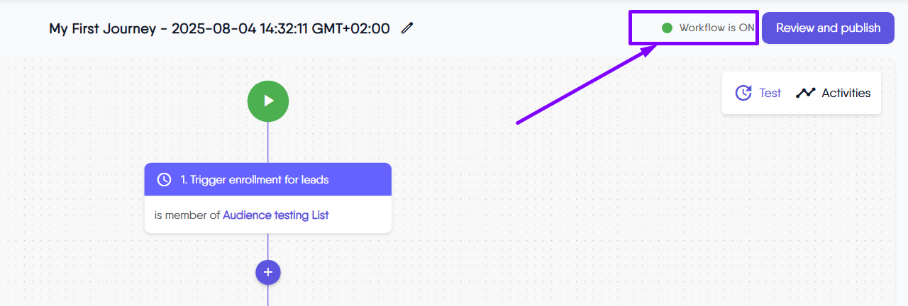 - The status is displayed clearly at the top of the journey builder or canvas, showing as either Workflow is ON (with a green indicator) or Workflow is OFF (with a red indicator).