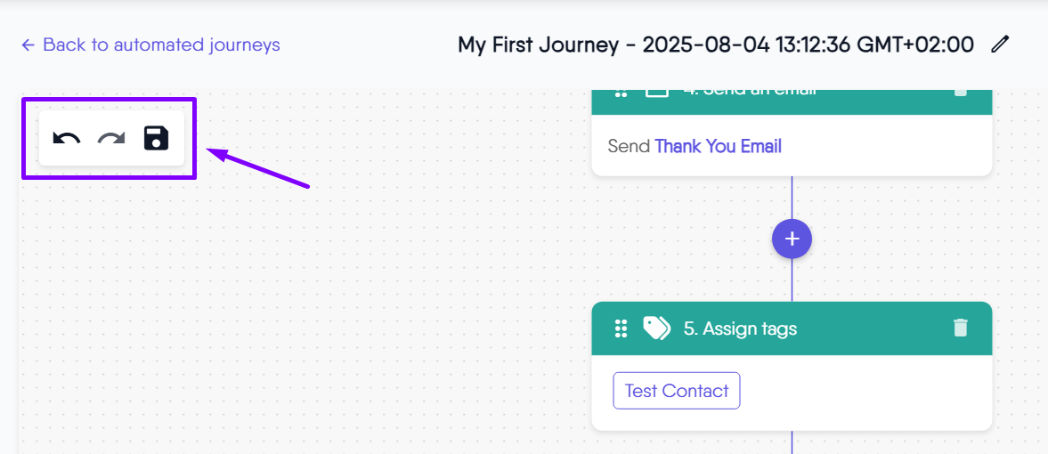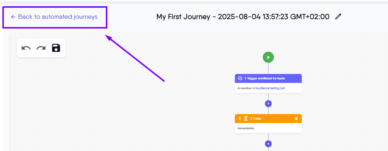 The Undo, Redo, and Save controls make it easy to confidently build and adjust your automated journey. These tools help you quickly reverse mistakes, revisit previous edits, and securely store your progress as you design or update your workflow.