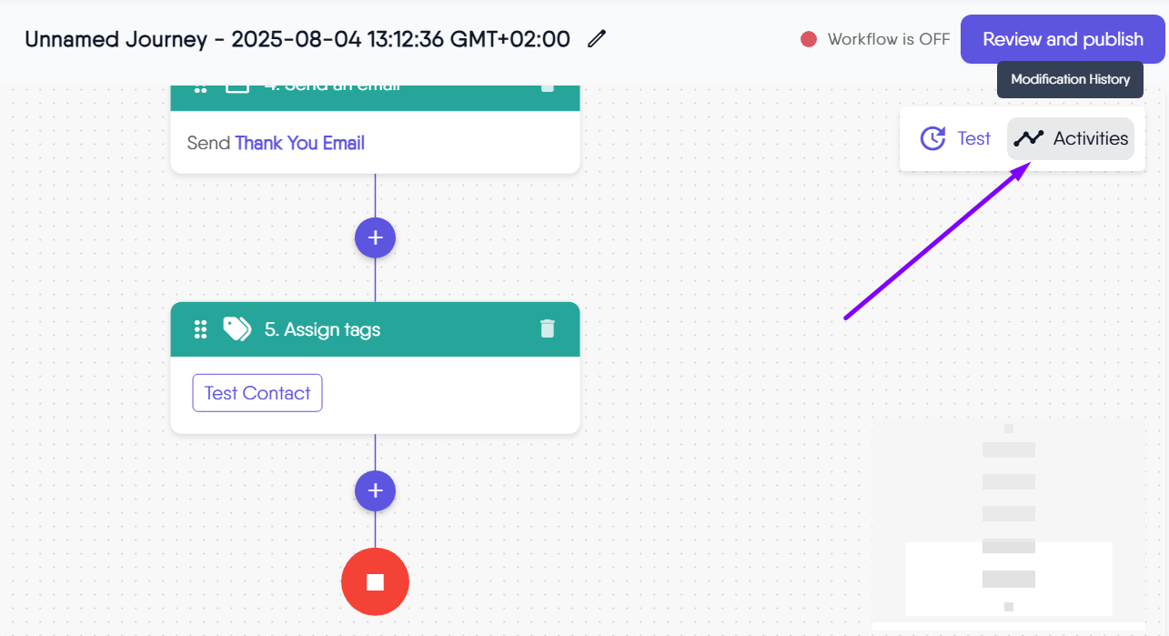 The Activities feature gives you a clear, chronological view of all changes made to your automated journey. Also known as Modification History, this tool helps you keep track of who made updates, what was changed, and when each modification occurred, providing transparency and control as you build and refine your workflows.