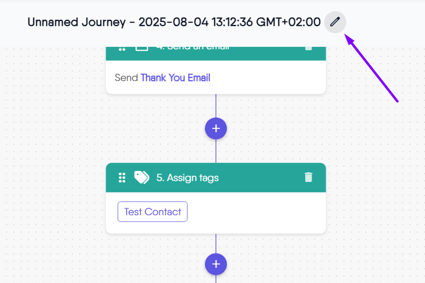 - At the top of the journey builder, you’ll see the current name of your workflow (e.g., “Unnamed Journey”) next to a pencil (edit) icon.