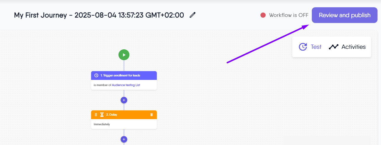 - Click the Review and publish button at the top of your journey builder or canvas when you are ready to finalize your automation.