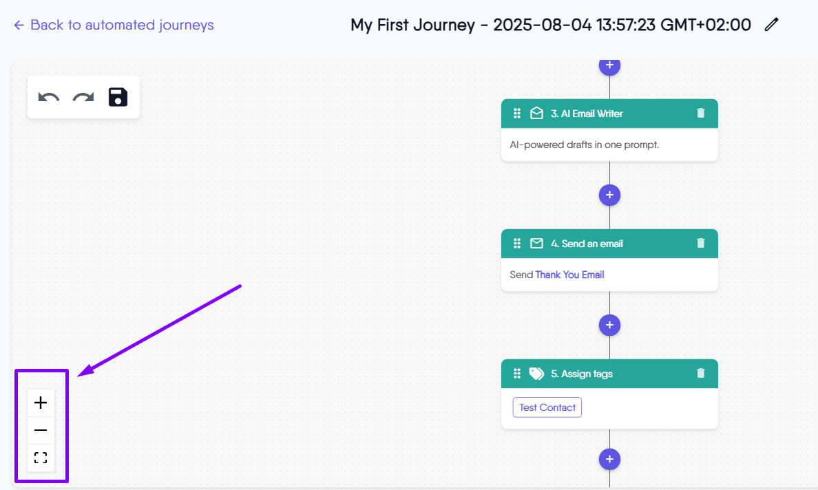 The Zoom In, Zoom Out, and Reset controls allow you to easily adjust your view of the automated journey canvas. These features help you navigate, review, and design complex workflows with greater ease and precision.