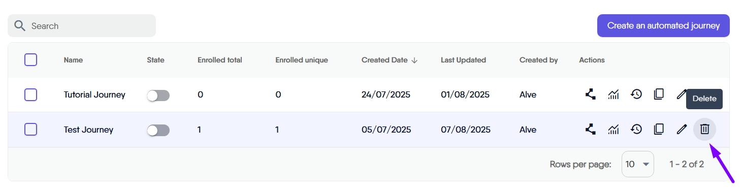 The Delete action allows you to permanently remove an automated journey. By clicking the Delete icon, you initiate a confirmation prompt to safeguard against accidental removal. Once confirmed, the selected journey and all its settings will be deleted and cannot be recovered.