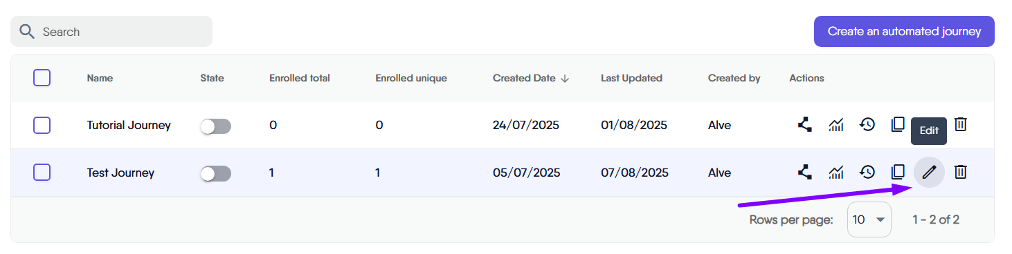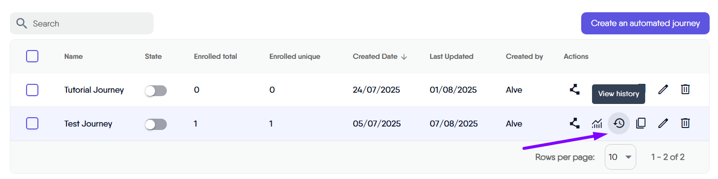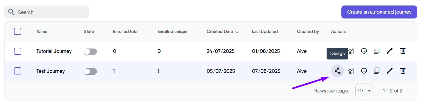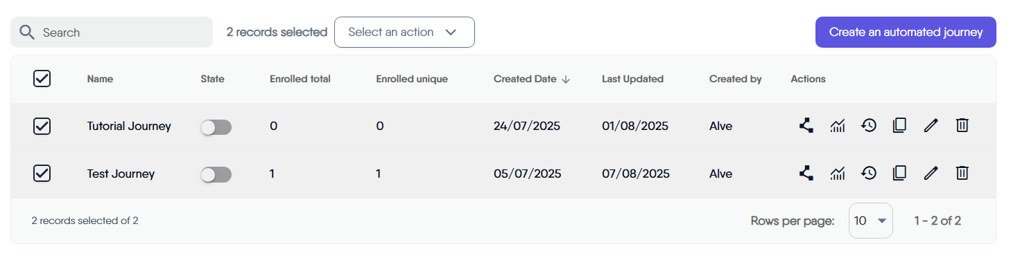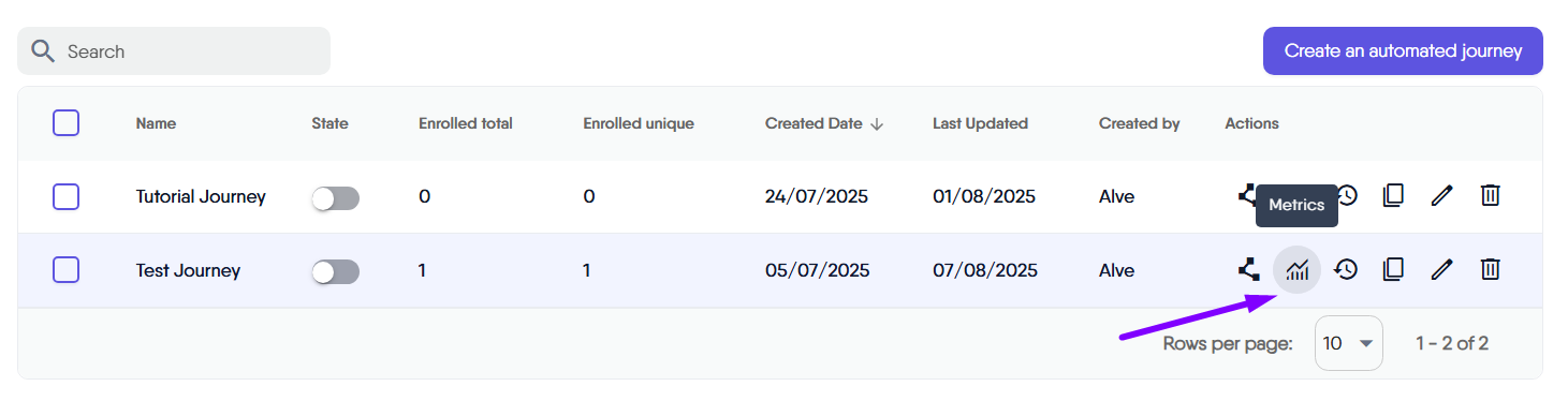 Shows the current status of each journey, so you can quickly see which ones are active and running. Use the toggle to turn automated journeys on or off as needed, allowing you to activate or deactivate journeys with a single click.