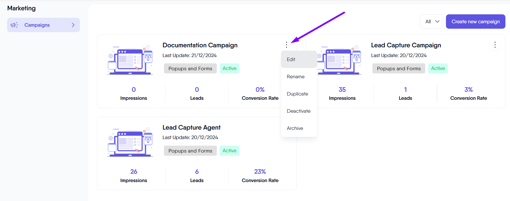 After the campaign is created, you’ll be redirected to the campaign dashboard. There, you can locate the email capture campaign you’ve just set up. Look for the following options to manage your campaign effectively.