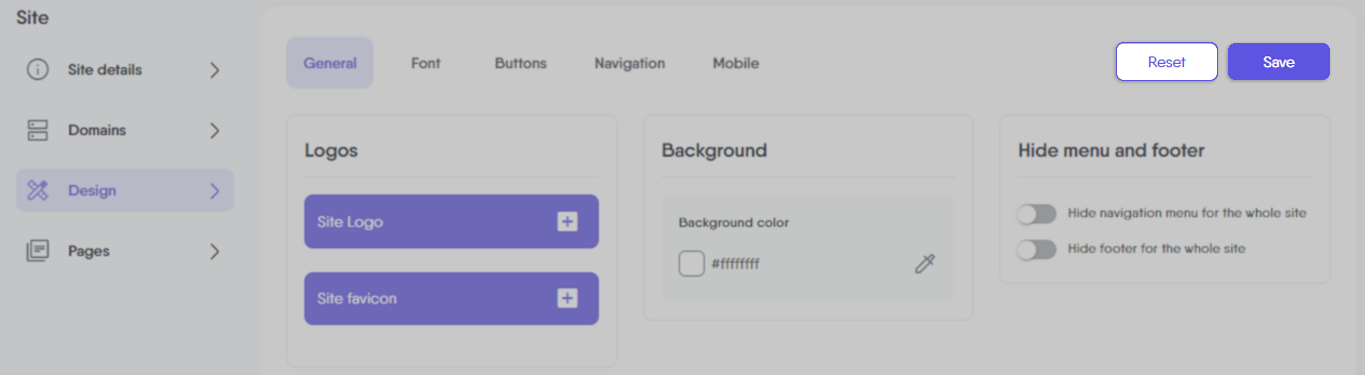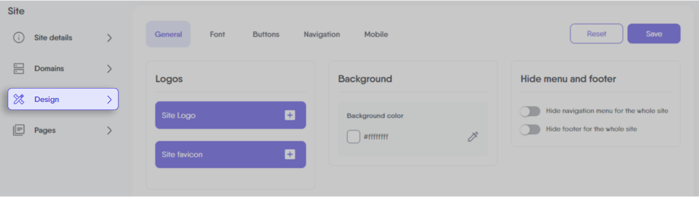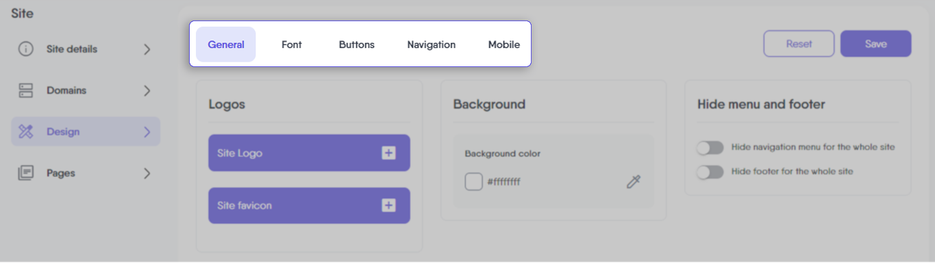 To access the design section in your LeadsWithDemos site, navigate to Site > Design. In this section, you will encounter various tabs, each offering specific customization options.