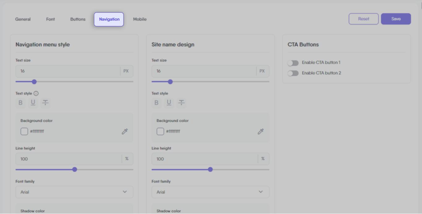 The Navigation tab in the Design Functionality offers extensive customization options for your landing pages’ navigation menu, and call-to-action (CTA) buttons. These settings ensure that your email capture landing pages’ navigation is not only functional but also aligns with your overall design aesthetics.