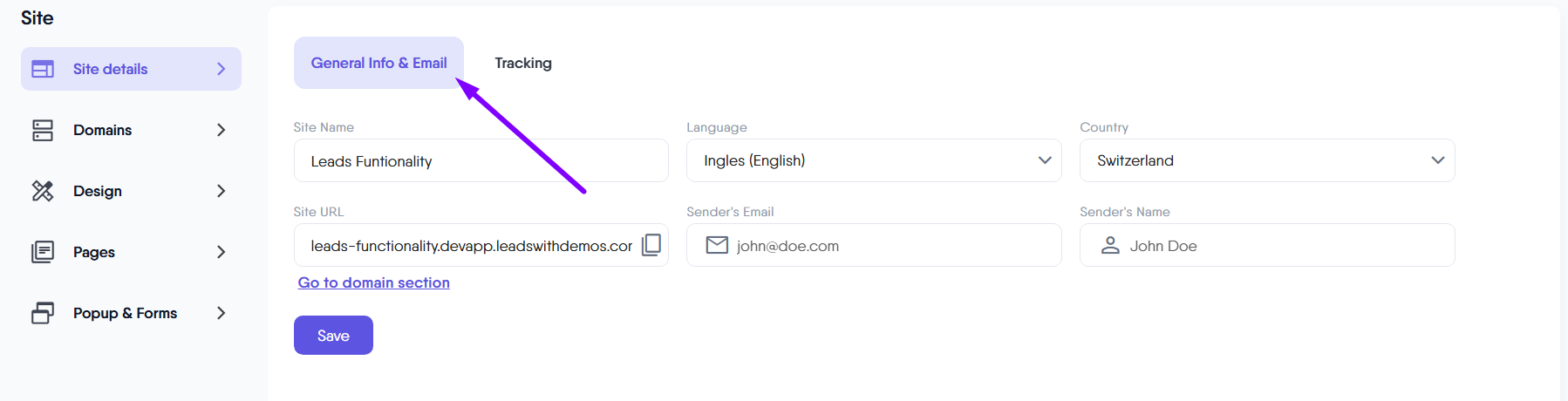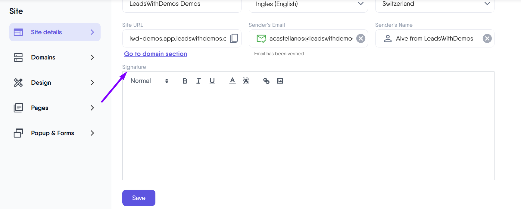 In this section, you’ll find key details about your site, such as its name, sender email information, and primary LeadsWithDemos site web address. This information is essential for how your site is identified and represented on your LeadsWithDemos account.