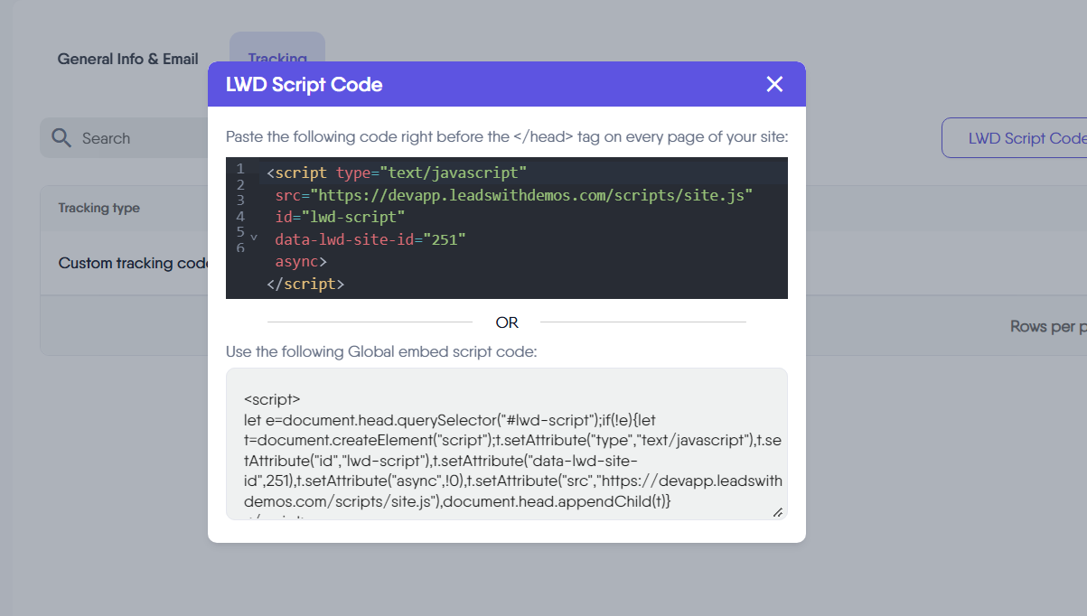 This tracking script is essential for displaying your LeadsWithDemos popups and forms on your website or any other site where you wish to show your LeadsWithDemos email capturing forms. For LeadsWithDemos landing pages, the “LWD tracking code” is integrated natively, so you do not need to add it manually.