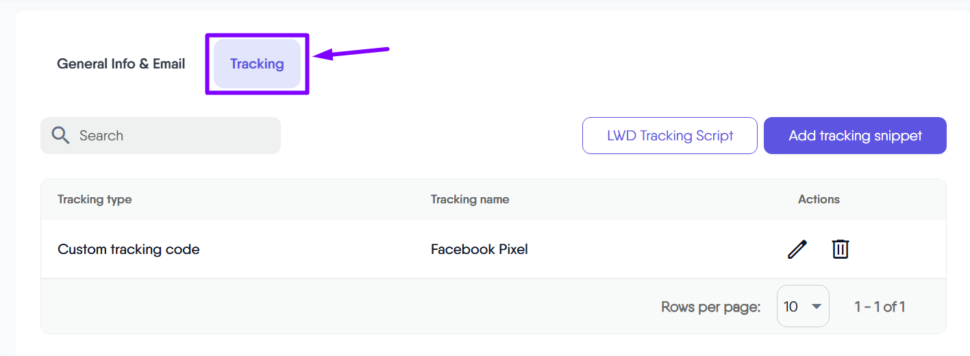 This table displays all your tracking snippets, providing an at-a-glance view of what’s currently implemented on your LeadsWithDemos site or landing pages. It’s essential for keeping your tracking organized and accessible.