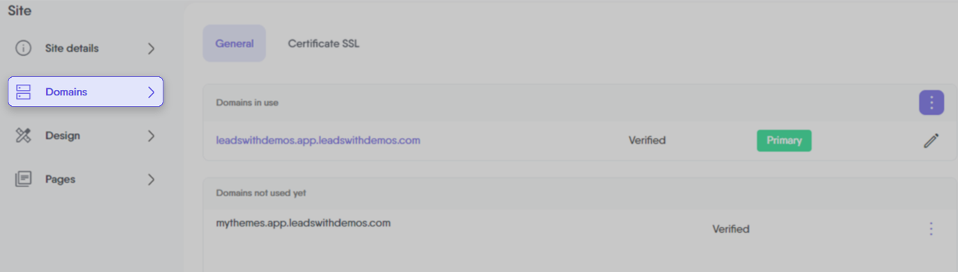 When you create a site in your LeadsWithDemos account, it is initially assigned a LeadsWithDemos subdomain. This default subdomain can be easily replaced with your own custom Top-Level Domain (TLD) or a custom subdomain of your choice.