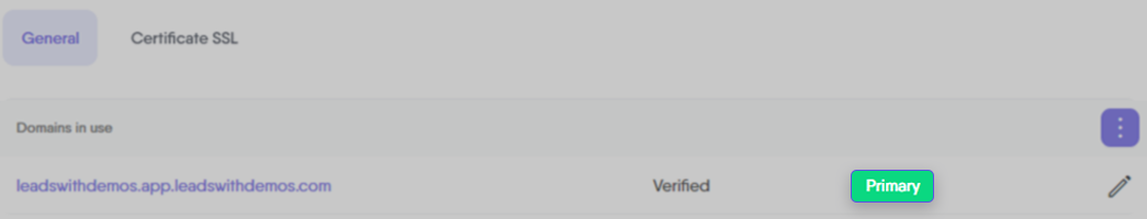 The domain tagged as “Primary” is your site’s main landing page domain. It serves as the foundation for all your landing pages. Your primary domain can be either the default LeadsWithDemos domain or a custom domain you’ve selected.