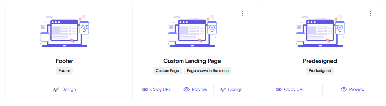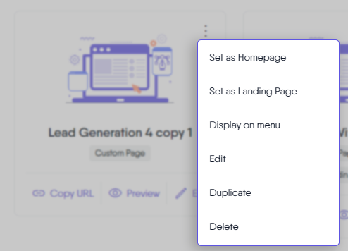 In your LeadsWithDemos site, each landing page and footer comes with its own options menu. This menu allows you to perform a variety of management tasks, with the available options depending on whether you are working with the footer or a landing page.