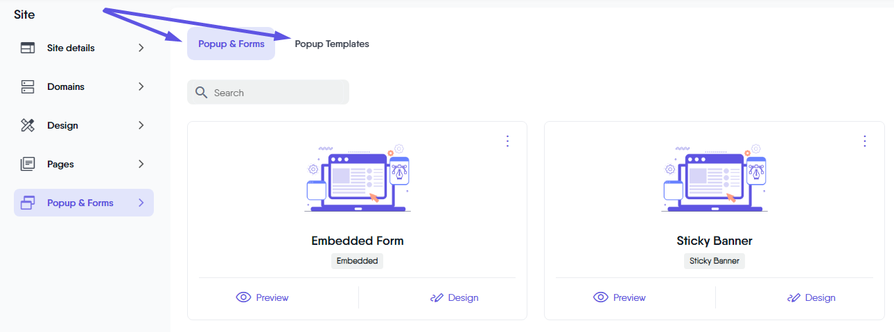 Upon accessing the LeadsWithDemos popup & forms section, you will encounter two main tabs: ‘Popup & Forms‘ and ‘Popup Templates‘.